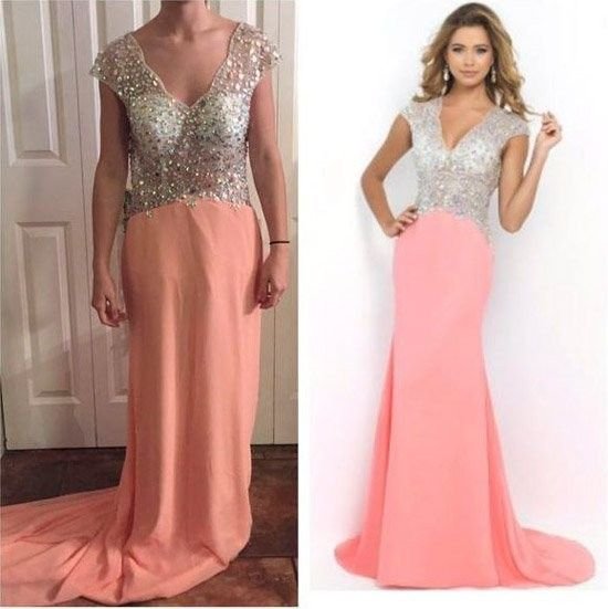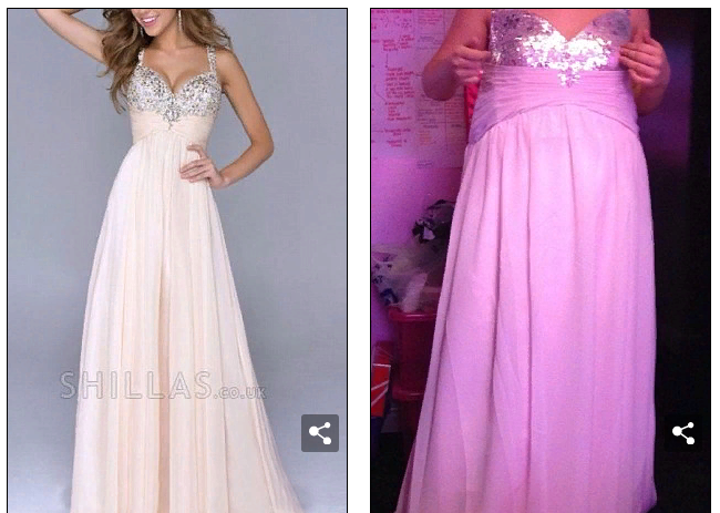 Взгляните на это вечерние платья. Они совершенно разные. Заказ был на шифоновое платье персикового цвета с отделкой блестками — получен заказ с жеванным розовым ужасом.